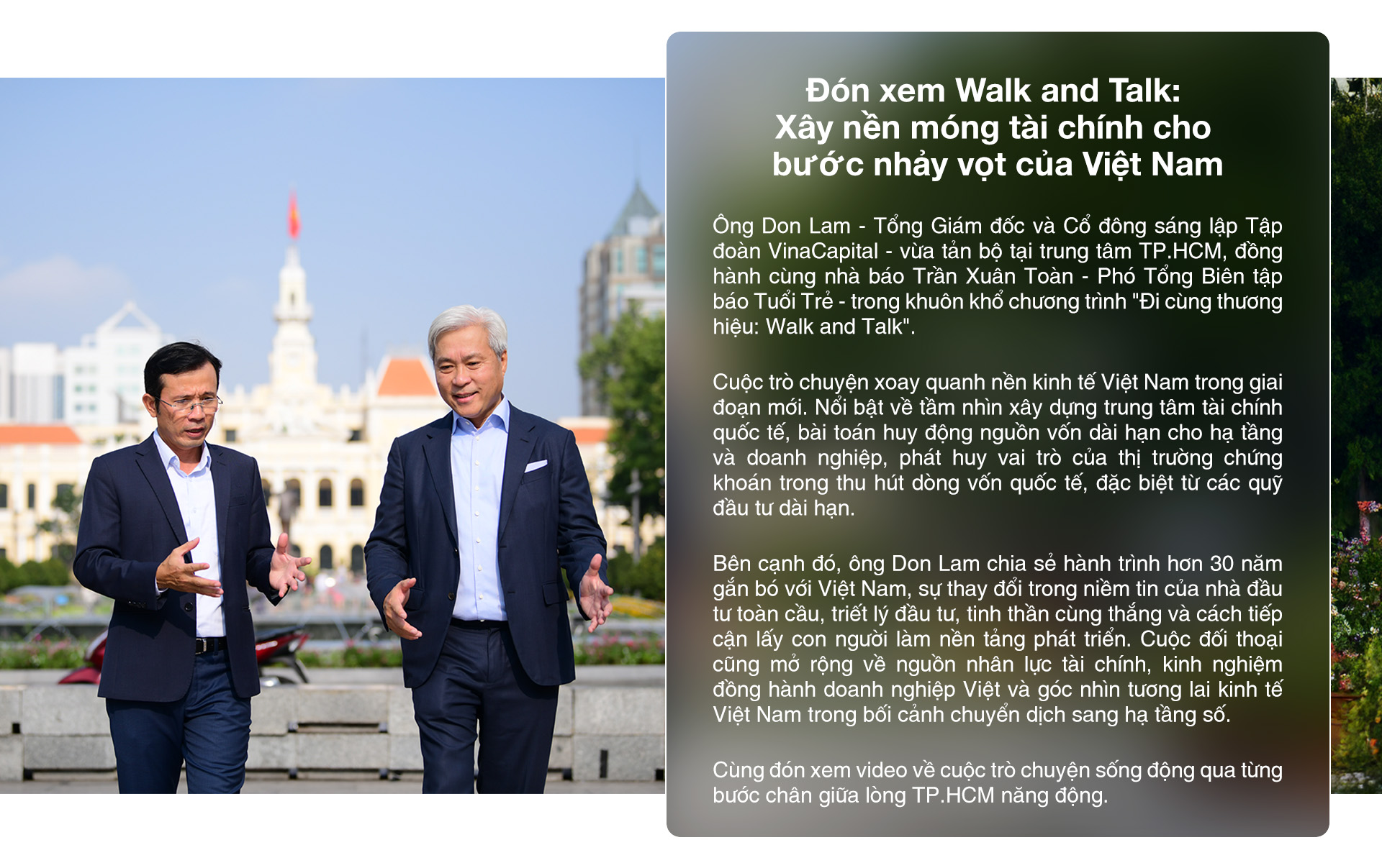 Ngay sau chuyến tháp tùng Phó Thủ tướng Thường trực trong chuyến thăm và làm việc tại Singapore, giữa bối cảnh Việt Nam vừa chính thức triển khai Trung tâm tài chính quốc tế (IFC), ông Don Lam - Tổng Giám đốc và Cổ đông sáng lập Tập đoàn VinaCapital, quỹ đầu tư hiện quản lý gần 4 tỉ USD - đã có cuộc trò chuyện đầu xuân với báo Tuổi Trẻ, trong chương trình Walk & Talk mùa 3.