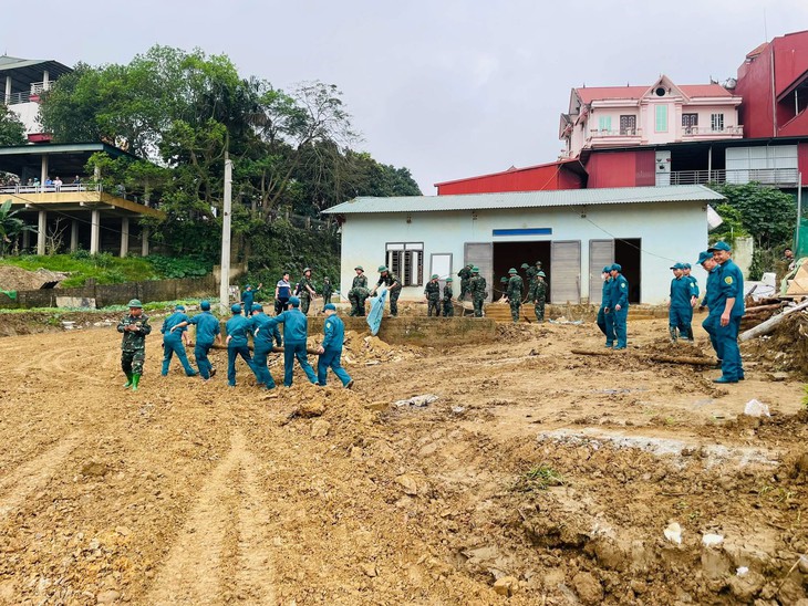 Lực lượng quân đội dọn dẹp để chuẩn bị bắc cầu phao qua sông Lô - Ảnh: ĐOAN HÙNG
